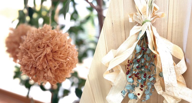 カンナくずを再利用してポンポンサシェやスワッグを作ります。